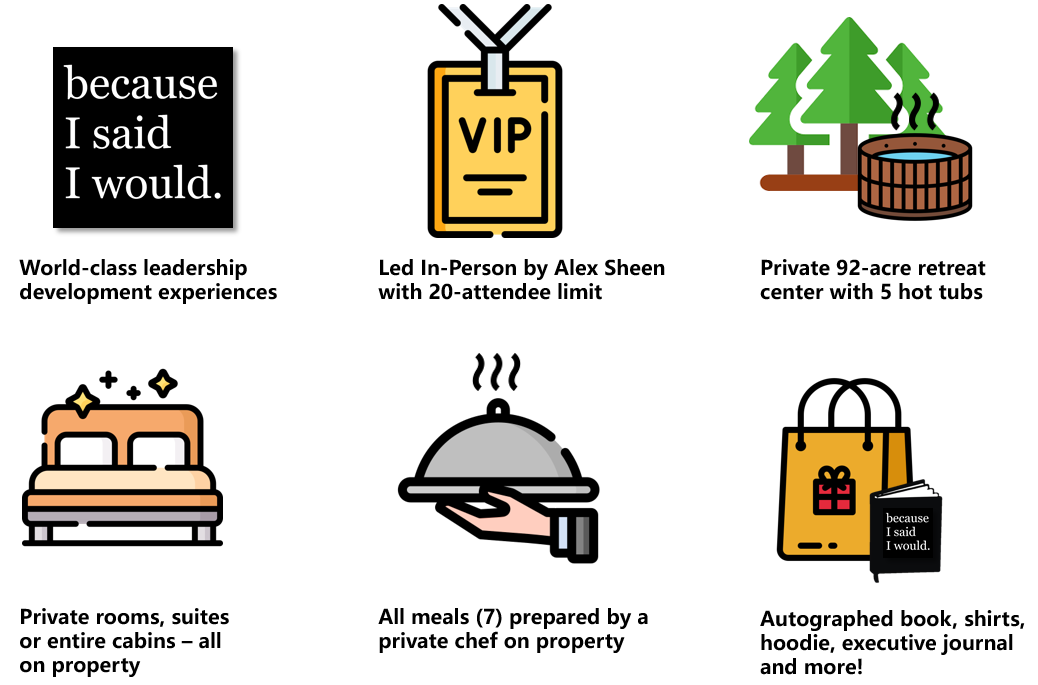 Join Alex Sheen, Founder of because I said I would and 5-time TEDxTalk speaker, for an immersive 3-day, 2-night retreat designed to equip leaders with the skills and mindset needed to thrive through adversity and lead with purpose. This retreat combines powerful workshops, hands-on activities, and personalized coaching to help you—and your team—take the next step in your leadership journey. With an absolute limit of only 20 participants, you will have an extremely rare opportunity to ask questions and interact with Alex directly.